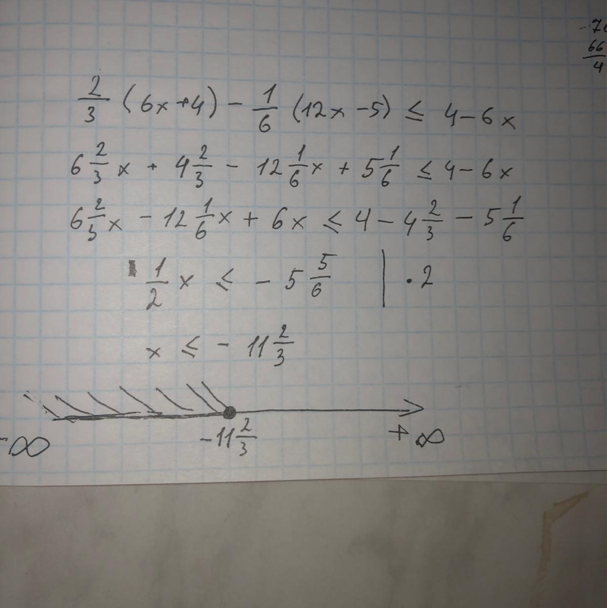 2/3 (6х + 4) - 1/6 (12х - 5) ≤ 4 - 6х раскрываем скобки