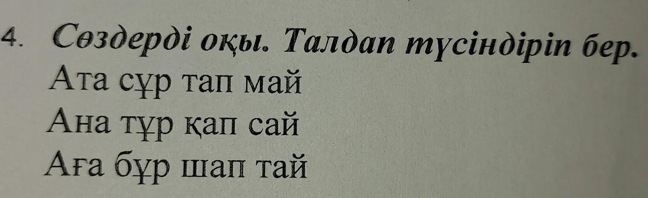4. Сөздерді оқы. Талдап түсіндіріп бер. Ата сұр тап май Ана тұр қап сай Аға бұр шап тай