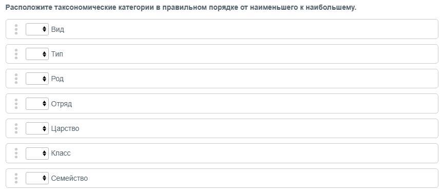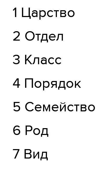 Расположите таксономические категории в правильном порядке от наименьшего к наибольшему.