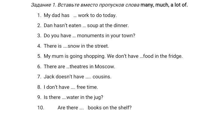 1. My dad has a lot of work today. 2. Dan hasn't eaten much soup for dinner. 3. Do you have many monuments in your town? 4. There is a lot of snow on the streets. 5. We don't have much food in the fridge. 6. There are many theatres in Moscow. 7. Jack doesn't have many cousins. 8. I don't have much free time. 9. Is there a lot of water in the jug? 10, Are there many books on the shelf?