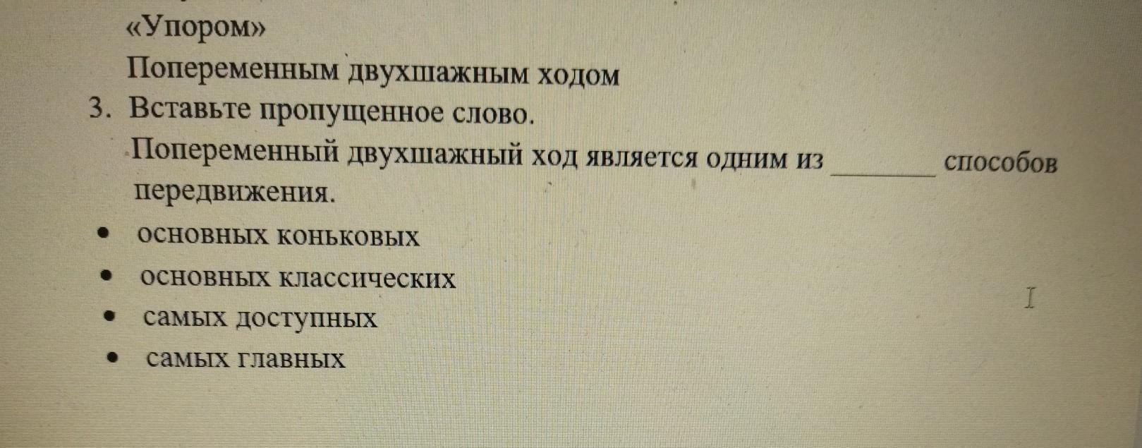 Попеременным двухшажным ходом 3. Вставьте пропущенное слово. Попеременный двухшажный ход является одним из __(ход) передвижения. основных коньковых, основных классических, самых доступных, самых Главных