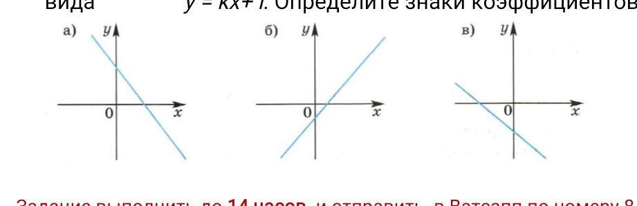 4) На рисунках изображены прямые, заданные уравнением вида у = kx+ l. Определите знаки коэффициентов k и l.