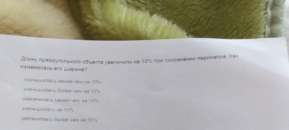 Длину прямоугольного объекта увеличили на 10% при сохранении периметра. Как изменилась его ширина? уменьшилась менее чем на 10° уменьшилась более чем на 10% увеличилась менее чем на 100% уіменьшилась на 100% увеличилась более чем на 10%