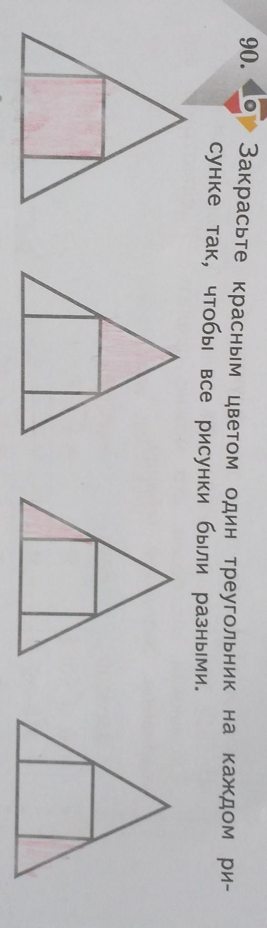 90. Закрасьте красным цветом один треугольник на каждом рисунке так, чтобы все рисунки были разными. Математика 4 класс. Как думаете правильно??