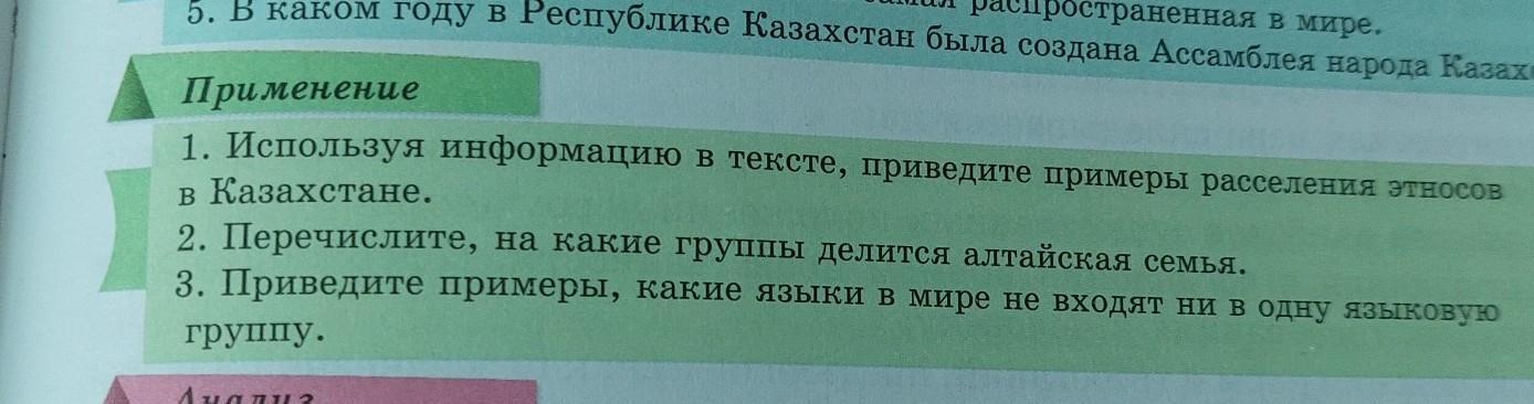 Применение 1. Используя информацию в тексте, приведите примеры расселения этносов в Казахстане. 2. Перечислите, на какие группы делится алтайская семья. 3. Приведите примеры, какие языки в мире не входят ни в одну языковую группу. Анализ