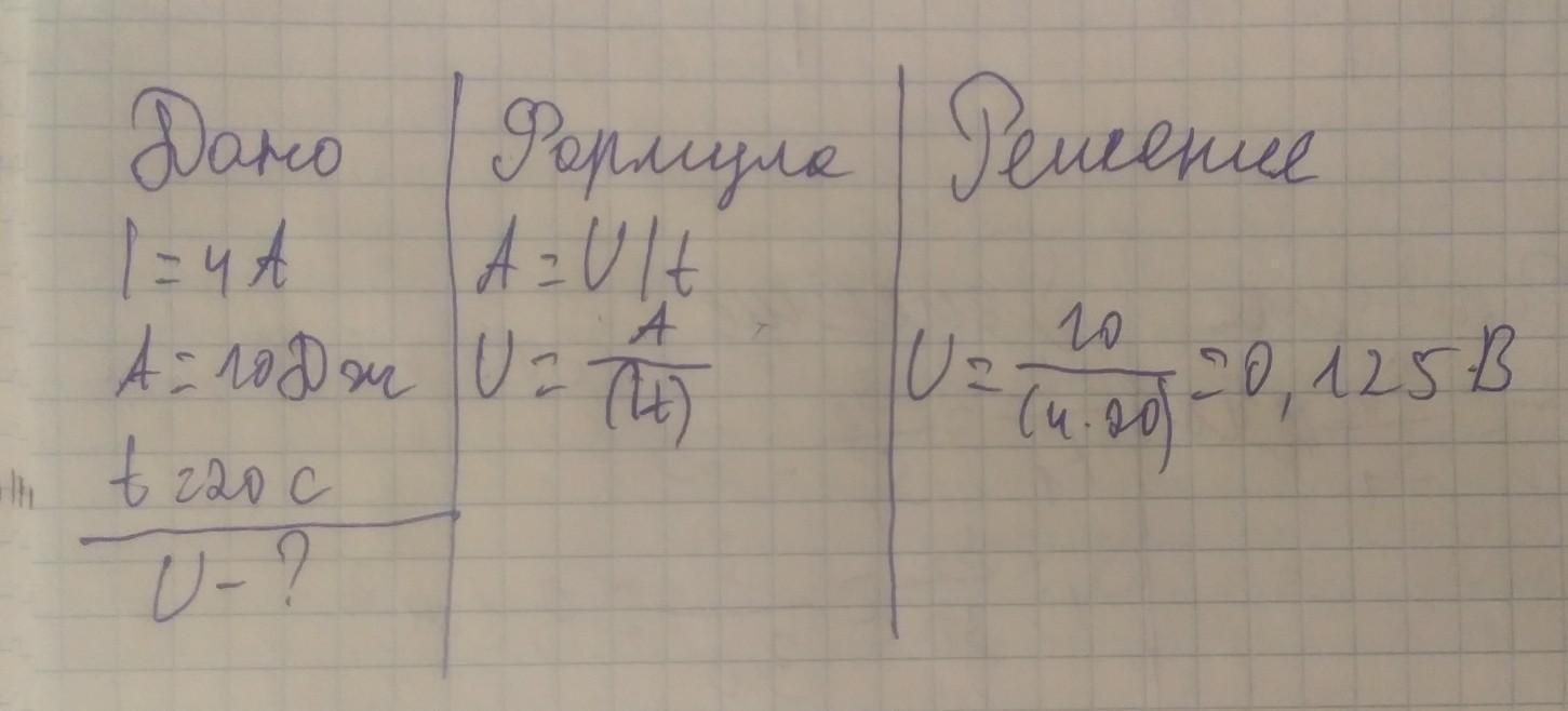 Помогите срочно: при силі струму 4 а на ділянці кола здійснення робота 10 Дж. Визначте напругу, якщо час виконання роботи 20 с