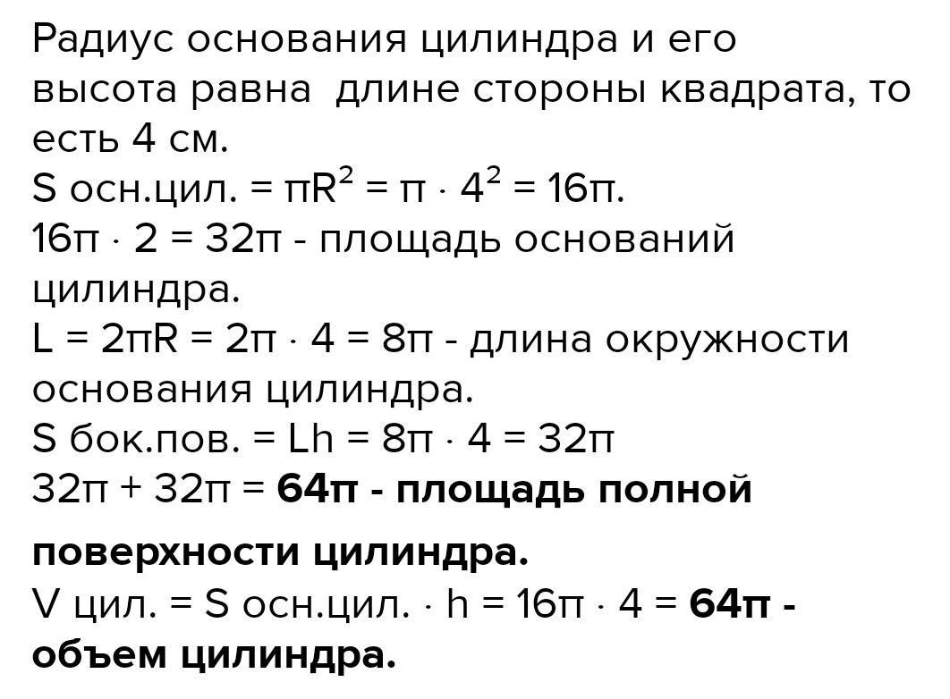 Цилиндр получен вращением квадрата со стороной 4см вокруг одной из сторон как оси симметрии.