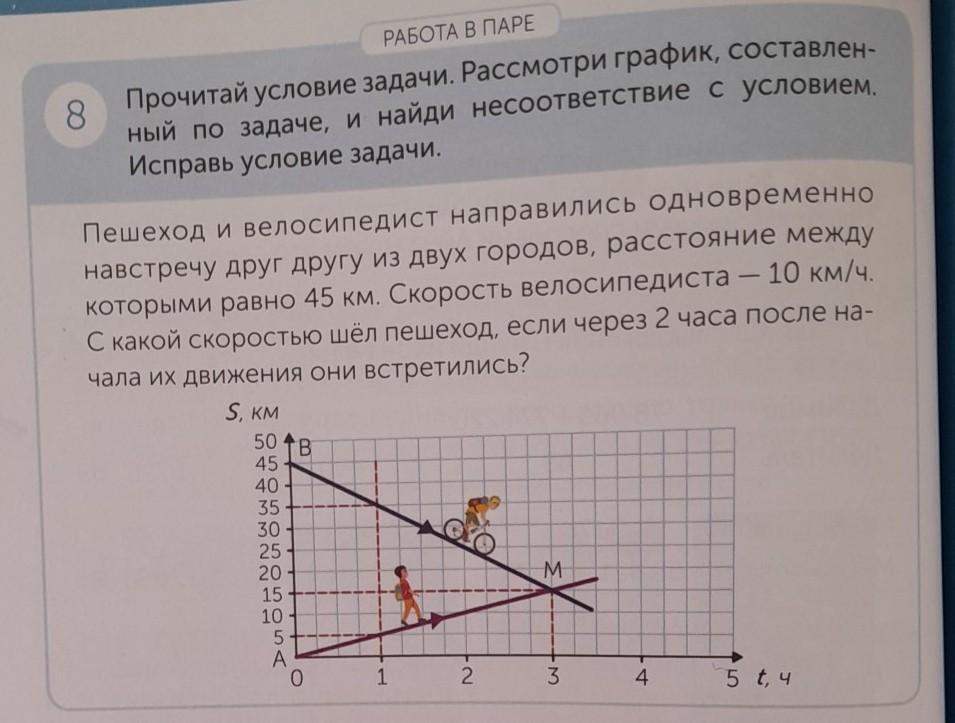 8 РАБОТА В ПАРЕ Прочитай условие задачи. Рассмотри график, составлен- ный по задаче, и найди несоответствие с условием. Исправь условие задачи. - Пешеход и велосипедист направились одновременно навстречу друг другу из двух городов, расстояние между которыми равно 45 км. Скорость велосипедиста — 10 км/ч. С какой скоростью шёл пешеход, если через 2 часа после на- чала их движения они встретились? S, KM 50 ТВ 45 40 35 30 25 20 15 10 о Na M Ул 2 0 1 2 +M) 3 4 5 t, ч