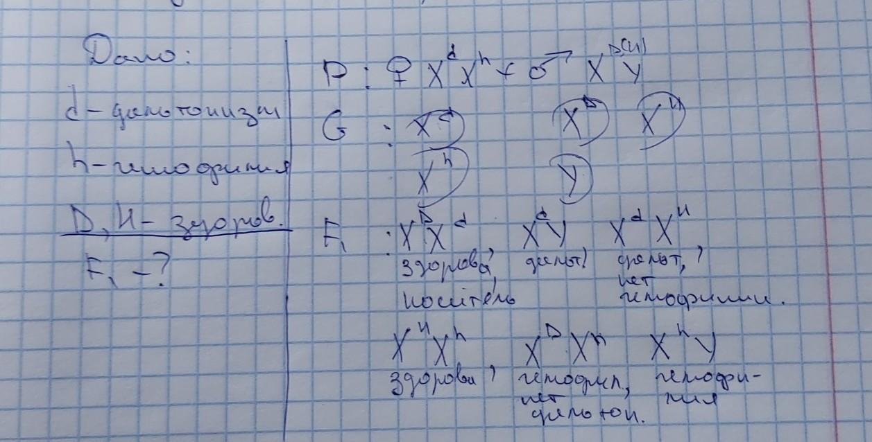 Решить задачу, оформить решение, записать ответ. Каковы возможны генотипы и фенотипы детей от брака здоровой женщины, но носительницы генов дальтонизма и гемофилии, расположенных в разных хромосомах, со здоровым по этим признакам мужчиной? ПОМОГИТЕ ПОЖАЛУЙСТА СРОЧНО!!!
