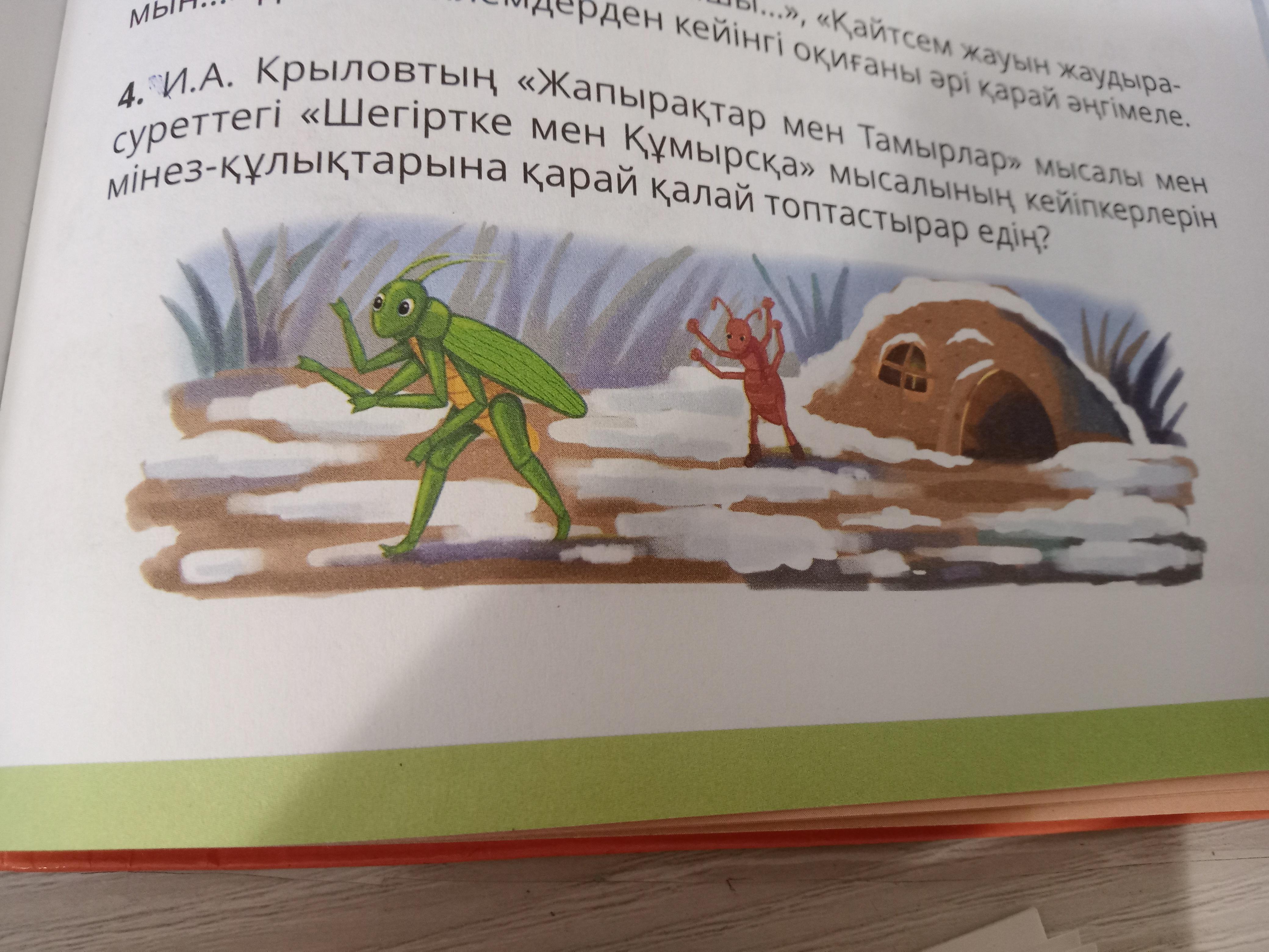 И. А Крыловтын "жапырактар мен тамырлар" мысалы мен суреттегы "шегыртке мен кумырска" мысалынын кейыпкерлерын мынез-кулыктарына карай калай топтастырар едын?