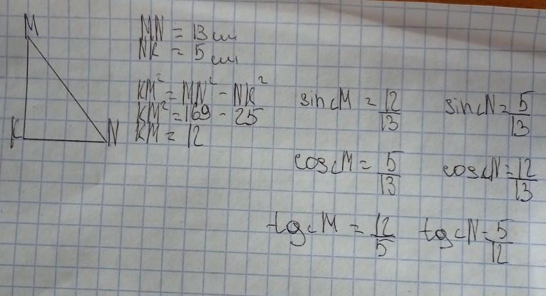 в треугольнике MNK угол K равно 90 градусов MN = 13 см , NK = 5 см Найдите синусы косинусы и тангенсы углов M и N