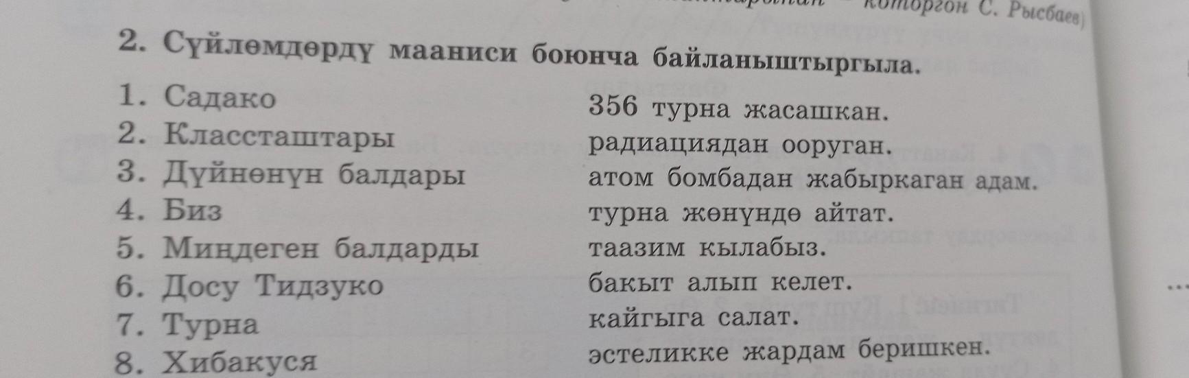 2. Сүйлөмдөрдү мааниси боюнча байланыштыргыла. 1. Садако 356 турна жасашкан. 2. Классташтары радиациядан ооруган, 3. Дүйнөнүн балдары атом бомбадан жабыркаган адам. 4. Биз турна жөнүндө айтат. 5. Миңдеген балдарды таазим кылабыз. 6. Досу Тидзуко бакыт алып келет. 7. Турна кайгыга салат. 8. Хибакуся эстеликке жардам беришкен.