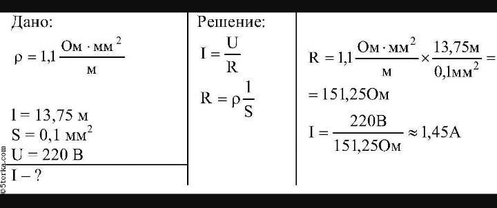 Спираль электрической плитки изготовлена из железной проволоки длиной 1 м и площадью сечения 2 мм2. Плитка рассчитана на напряжение 220 В. Определите силу тока в спирали плитки.