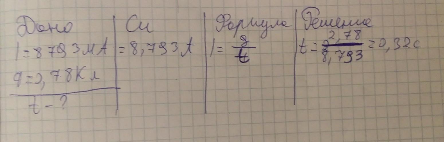 сила тока в нагревательном элементе тостера равна 8793мА.За какое время через поперечное сечение нагревательного элемента протекает заряд 2,78Кл?