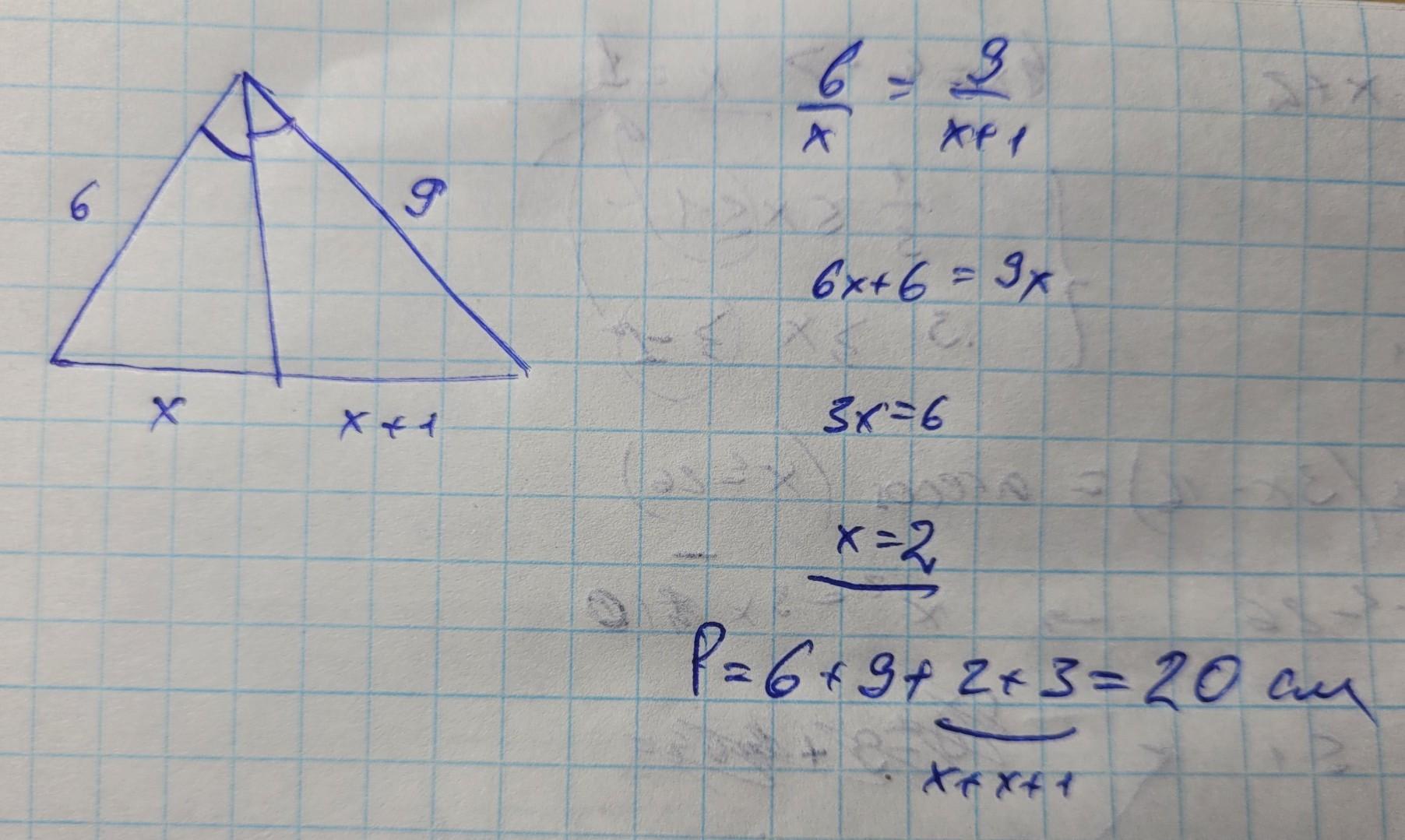 Бісектриса трикутника дiлить сторону на відрізки, різ ниця яких 1 см. Знайдіть периметр трикутника, якщо дві інші сторони дорівнюють 9 см і 6 см.