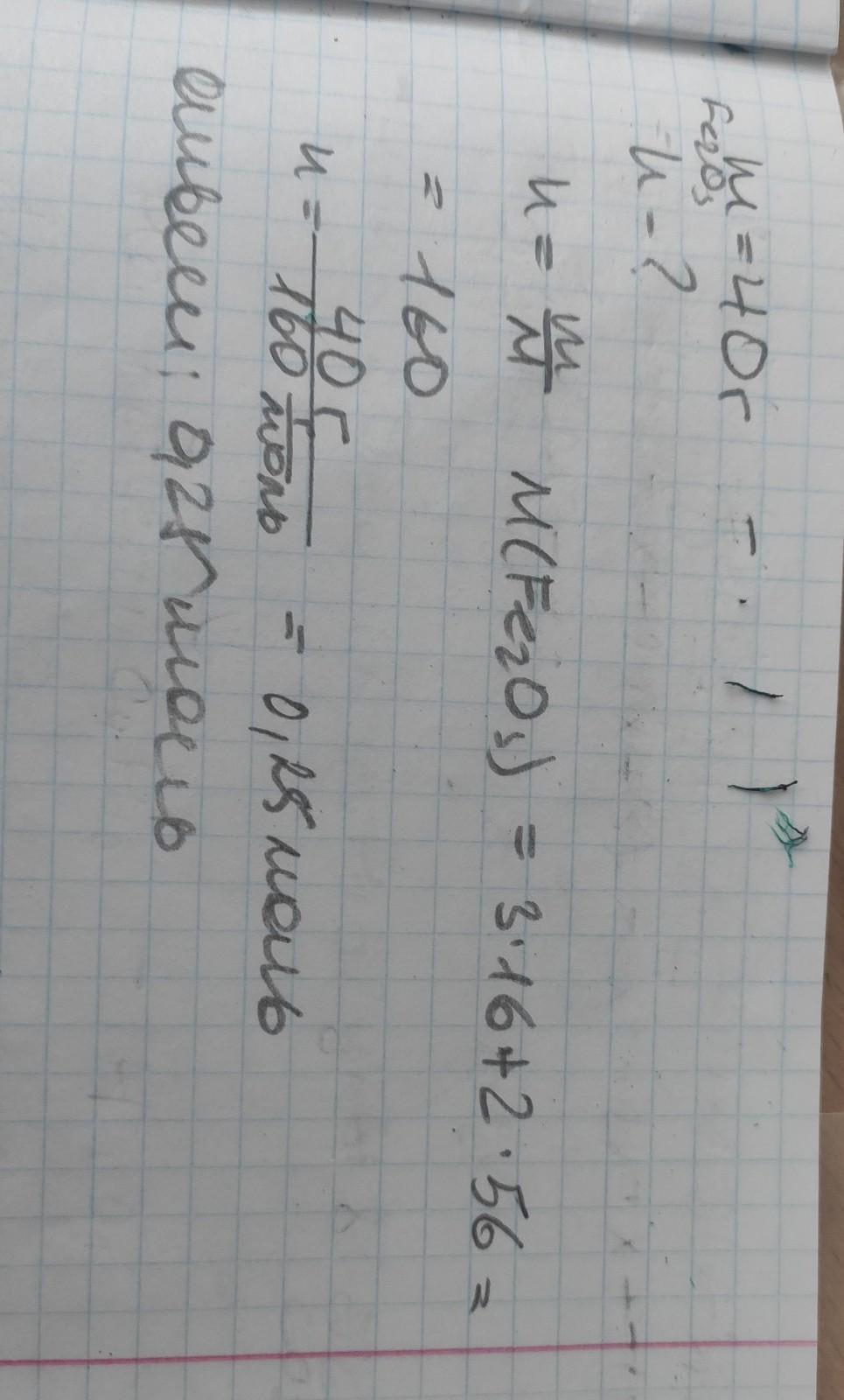 Обчисліть кількість речовини в порції ферум (III) оксиду масою 40 г.