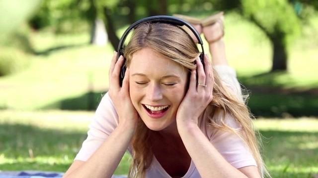 On the picture we can see a woman.She is listening music.She is look happy.She’s stay in the park.Weather is good