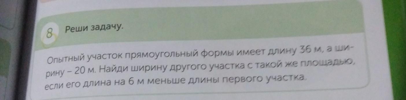 опытный участок прямоугольной формы имеет длину 36 м а ширину 20 м Найди ширину другого участка с такой же площади если его длина на 6 м меньше длины первого участка. Помогите пожалуйста.