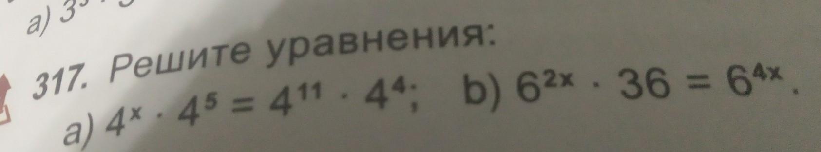317. Решите уравнения: а) 4х. 45 = 411 . 44; b) 62x . 36 = 64х.