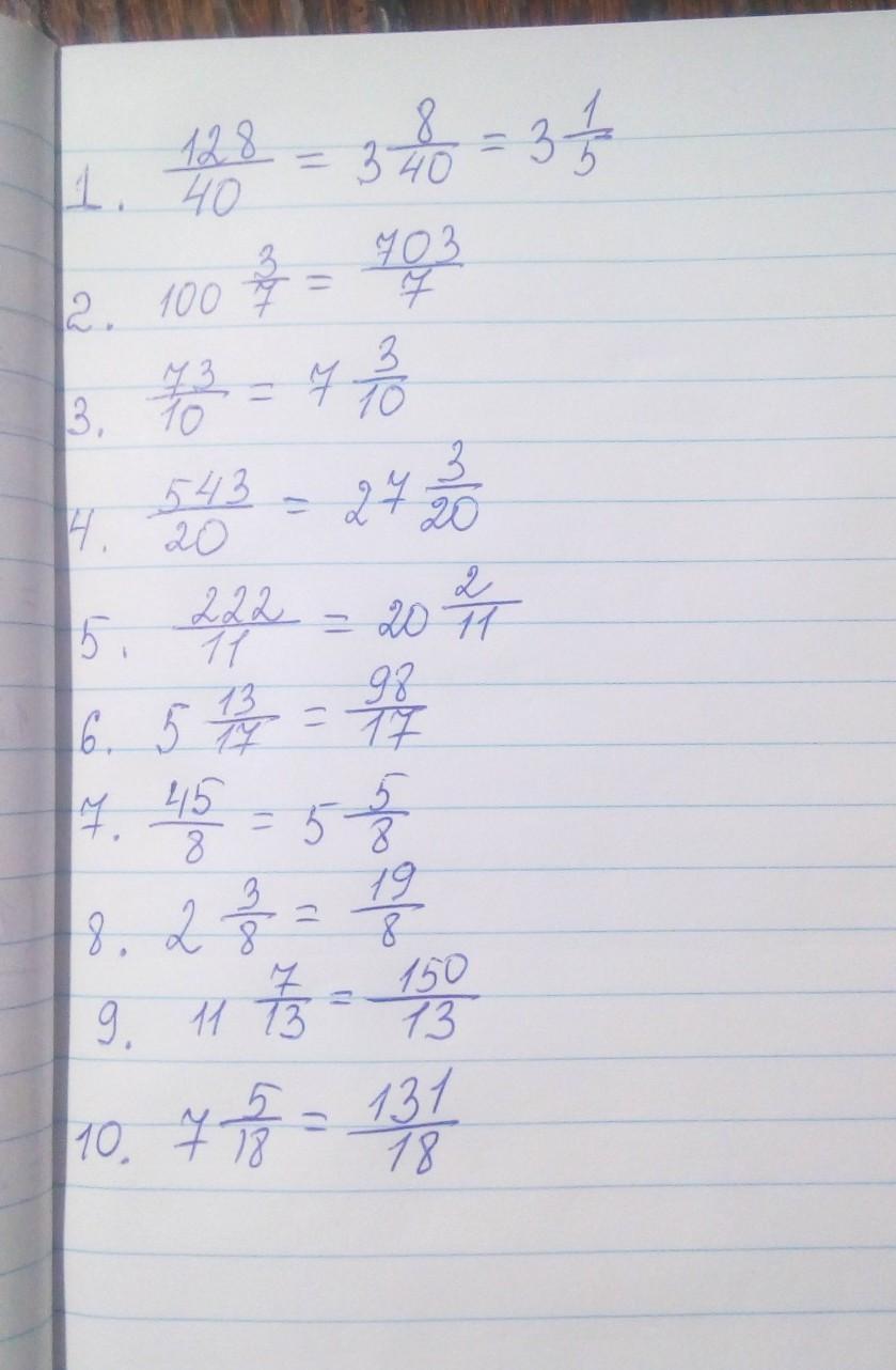 1. Представьте неправильную дробь в виде смешанного числа: 128/40