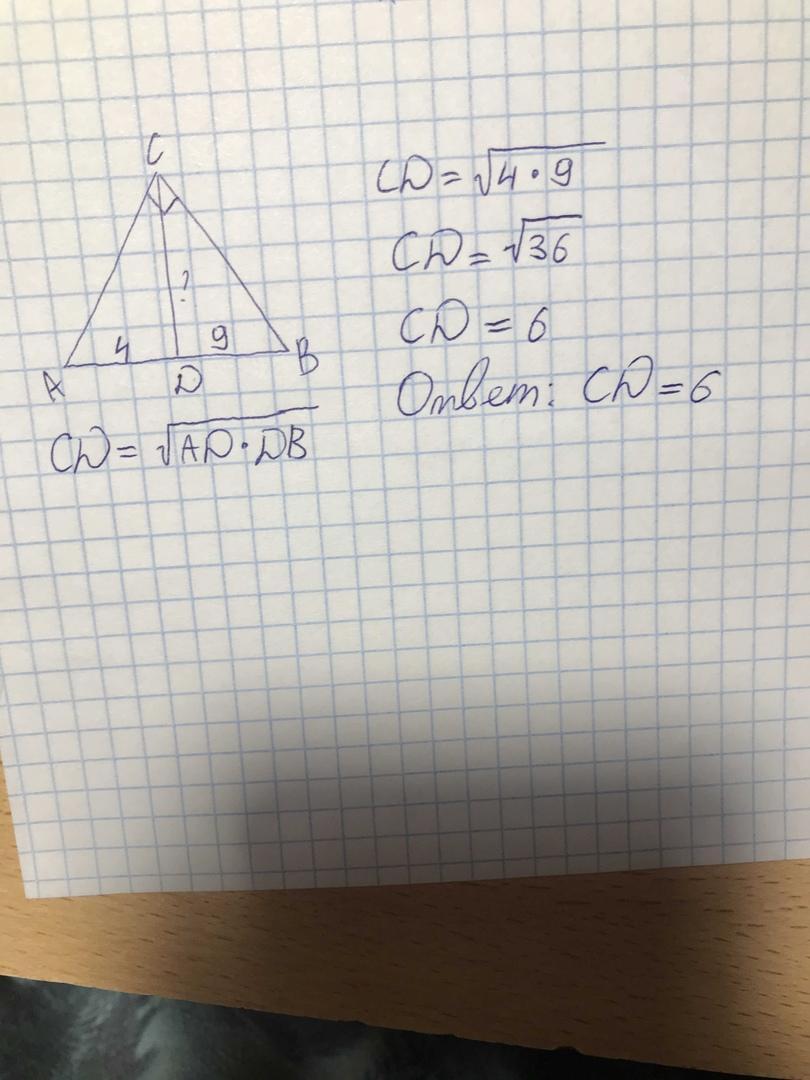 В прямоугольном треугольнике ABC с прямым углом C проведена высота CD так, что AD = 4, DB = 9. Найдите высоту CD треугольника ABC.