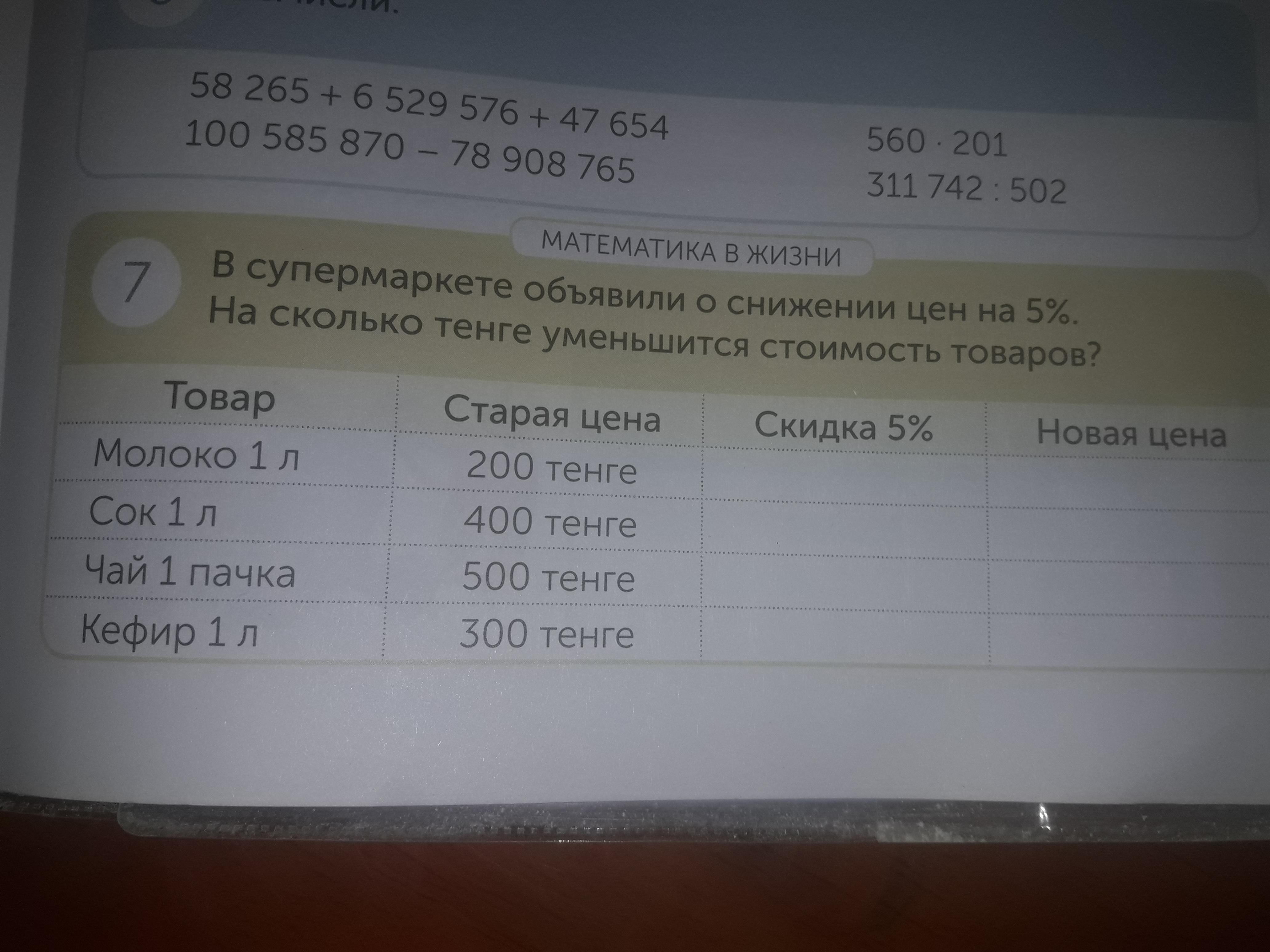 5%=5/100=0,05 молоко : 200-200×0,05=200-10=190 : СОК : 400-400×0,05=400-20=380 ; Чай : 500-500×0,05=500-25=475 ; кефир : 300-300×0,05=300-15=285