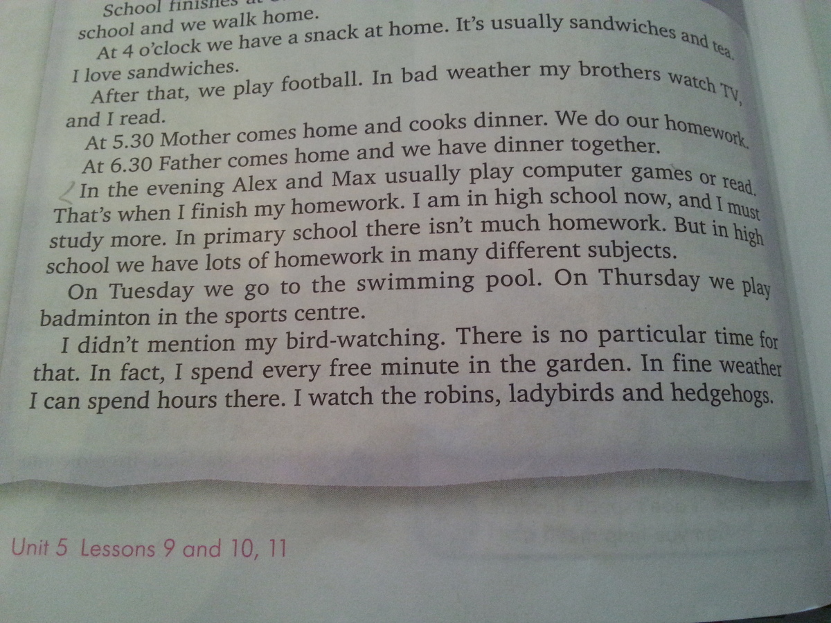 7) Школа начинается в 8.50. 8) В 12 часов мы обедаем. 9) Затем во второй половине дня мы играем в игры. 10) Школа заканчивается в 3.15. 11) Я забираю моих братьев из школы, и мы идем домой. 12) В 4 часа мы перекусываем дома. 13) Это обычно бутерброды и чай. 14) Я люблю бутерброды.15) После этого мы играем футбол. 16) В плохую погоду мои братья смотрят телевизор, а я читаю. 17) В 5.30 мама приходит домой и готовит ужин. 18) мы делаем наше домашнее задание. 19) В 6.30 папа приходит домой и мы ужинаем вместе. 20) Вечером Алекс и Макс обычно играют в компьютерные игры или читают. 21) Именно тогда я заканчиваю свою домашнюю работу. 22) Сейчас я в старшей (средней) школе, и Я должен больше учиться. 23) В начальной школе было не так много домашних заданий. 24) Но в средней школе мы делаем много домашних заданий в различных предметов. 25) Во вторник мы идем в бассейн. 26) В четверг мы играем в бадминтон в спортивном центре. 27) Я не упомянул мое наблюдение за птицами. 28) Там нет особого времени для этого. 29) На самом деле, я провожу каждую свободную минуту в саду.30) В хорошую погоду я могу провести целые часы там. 31) Я смотрю на малиновки, божьих коровок и ежей. 32) Я играю с моими братьями перед сном. 33) Когда они находятся в постели, я рассказываю им интересные факты о животных и птиц. 34) Они любят слушать меня. 35) Иногда я рассказываю им историю или сказку. 36)Мальчики любят это тоже. 37) Затем я пишу в своем дневнике и ложусь спать в 10.30