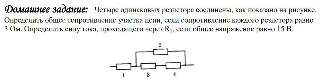 для расчёта сопротивления сначала исключаем сложные участки. 3+4 резистор = 6 Ом. (2+ (3+4))/2 =( 3+6) /2=4.5 Ома. Общее сопротивление это ещё + резистор 1, тоесть 7,5 Ом. Ну а с током совсем просто - по закону Ома I=U/R 15/7,5=2 Ампера