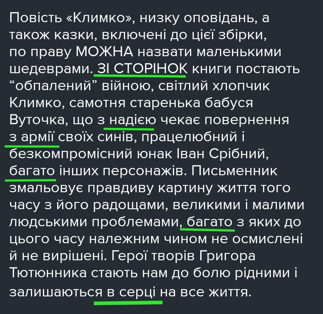 дам баллы Повість «Климко», низку оповідань, а також казки, включені до цієї збірки, по праву МОЖНА назвати маленькими шедеврами. ЗІ СТОРІНОК книги постають “обпалений” війною, світлий хлопчик Климко, самотня старенька бабуся Вуточка, що з надією чекає повернення з армії своїх синів, працелюбний і безкомпромісний юнак Іван Срібний, багато інших персонажів. Письменник змальовує правдиву картину життя того часу з його радощами, великими і малими людськими проблемами, багато з яких до цього часу належним чином не осмислені й не вирішені. Герої творів Григора Тютюнника стають нам до болю рідними і залишаються в серці на все життя.