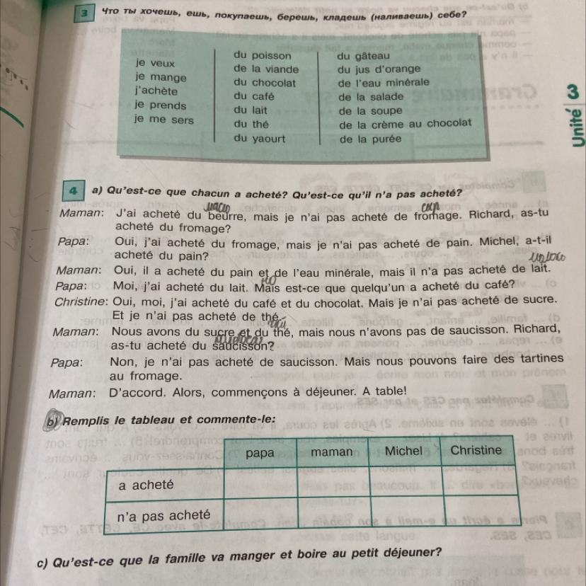 Ответ:maman a achete du beurre , elle n a pas achete de fromage papa a achete du fromage, du lait , il n a pas achete de pain et de saucisson Michel a achete du pain et l eau minerale , il n a pas achete de lait Christine a achete du cafe et du chocolat elle n a pas achete de the Объяснение:Обратите внимание на надстрочные знаки! с ноутбука не могу их поставить