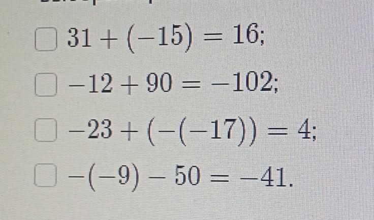 Выбери верные ответы: 31 + (-15) = 16; -12 + 90 = -102; -23+(-(-17)) = 4; -(-9) - 50 = -41. плиз