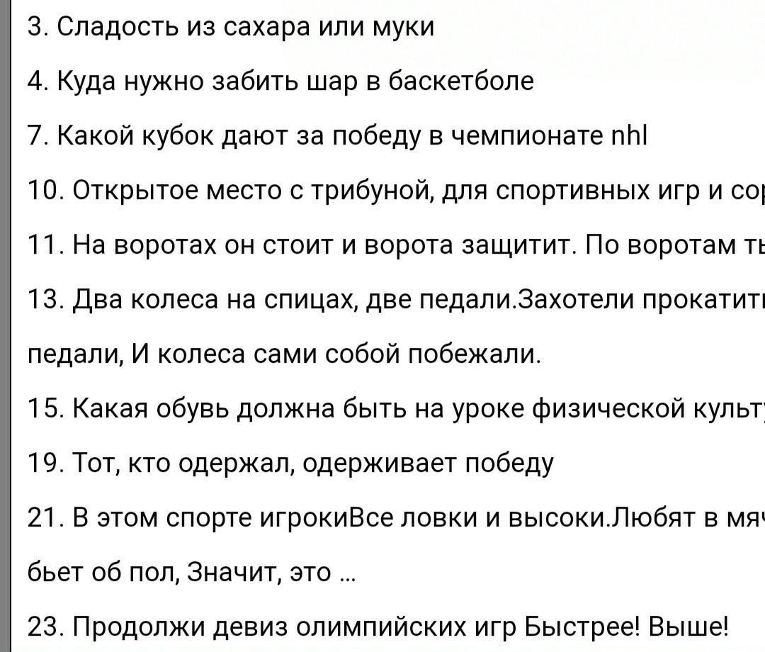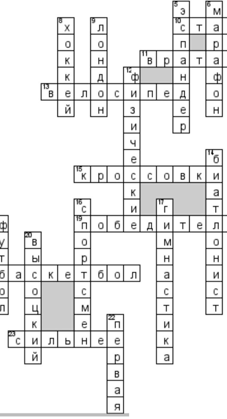 Ответы: 1 — велосипед, 2 — победа, 3 — коньки, 4 — ролики, 5 — шахматы, 6 — санки, 7 — мот, 8 — ракетка, 9 — ринг, 10 — лыжи.