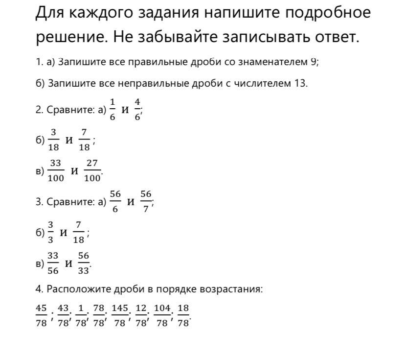 a) 1/6 < 4/6 ; б) 3/18 < 7/18 ; в) 33/100 > 27/100 .