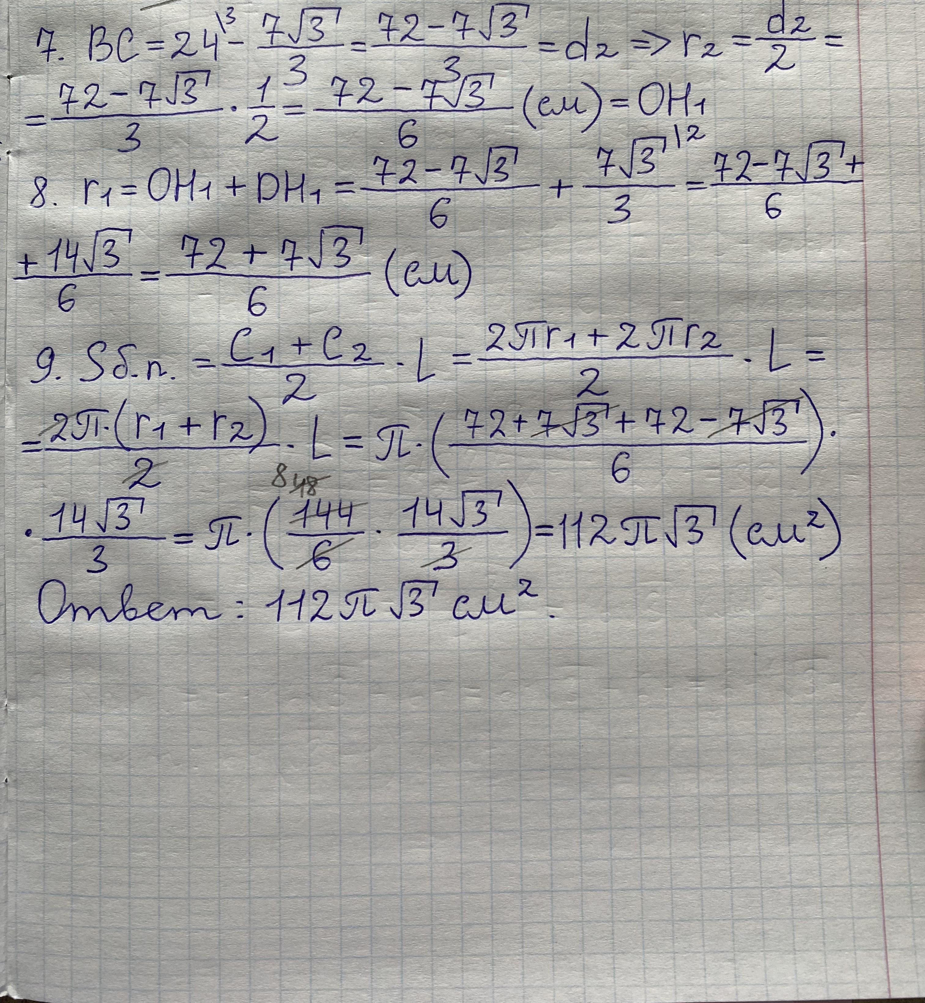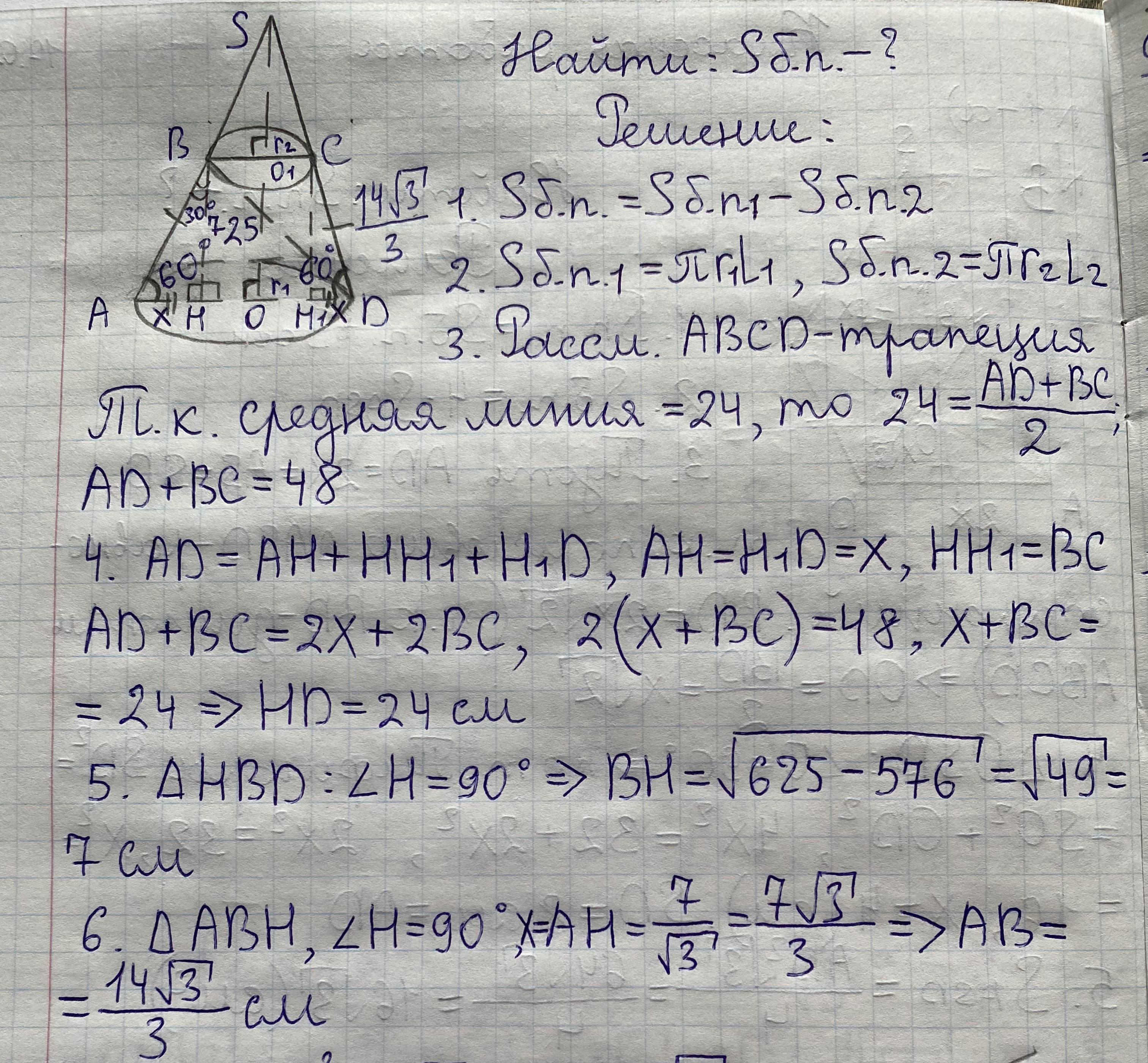 4. Осевое сечение усеченного конуса - равнобедренная трапеция, острый угол которой равен 60°, диагональ - 25 см и средняя линия - 24 см. Найдите площадь боковой поверхности усеченного конуса. Помогите пожалуйста!!!