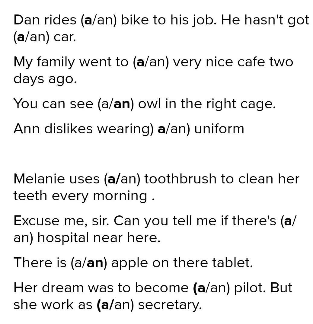 Dan rides (a/an) bike to his job. He hasn't got (a/an) car.