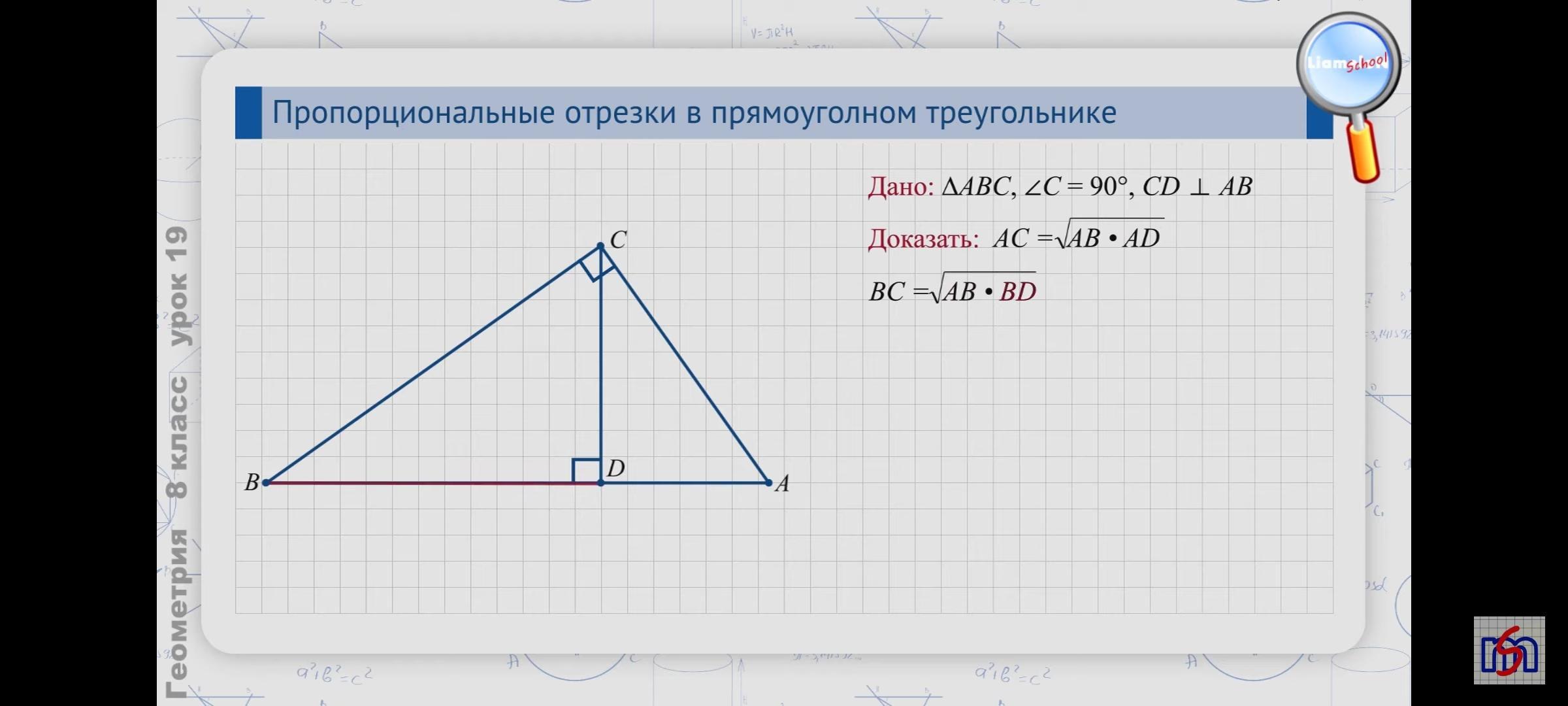 дан треугольник abc угол с равен 90 сд перпендикулярно ав докажите что ас=√аб*ад;бс=√аб