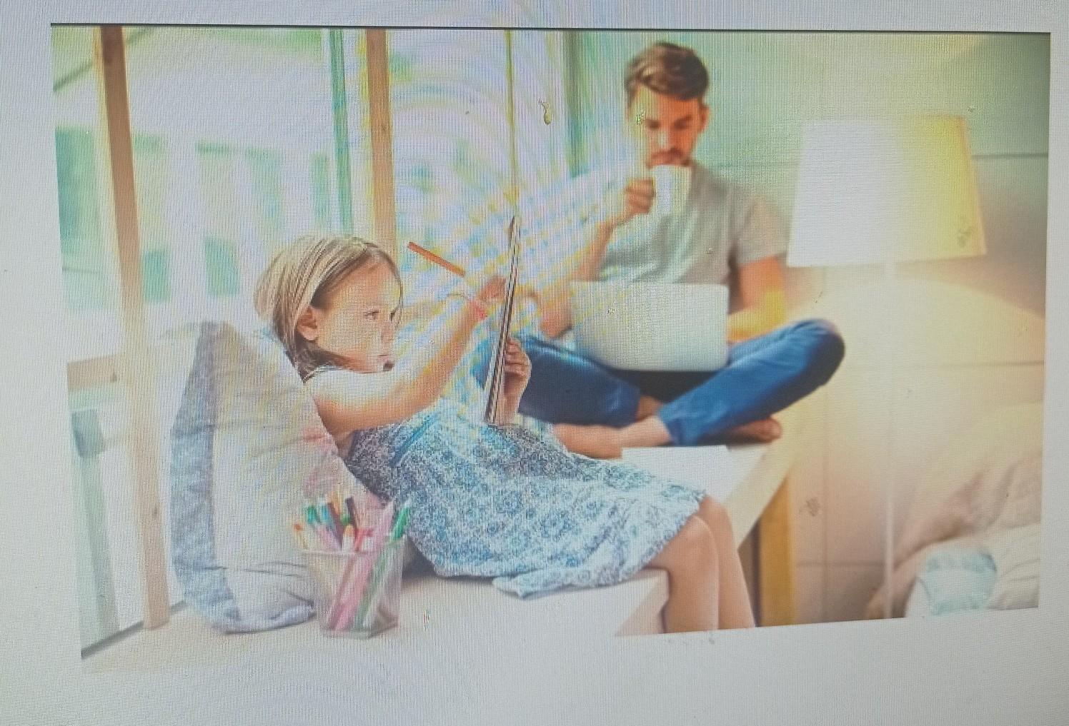 Отец по моему мнению занят своей работой на отдельном расстояния,и дочь увлекается рисованием.