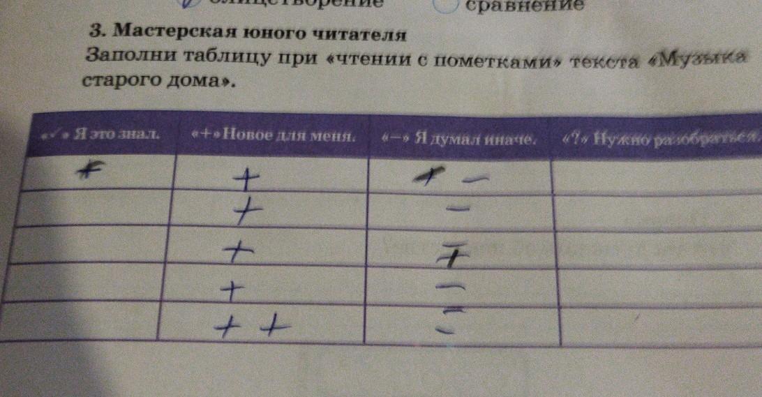 3. Мастерская юного читателя Заполни таблицу при чтении с пометками, текста «Музыка старого дома». у — Ялто знал, «+» Новое для меня. — Я думал иначе, «?» Нужно разобраться. скорей помогите пожалуйста с этим