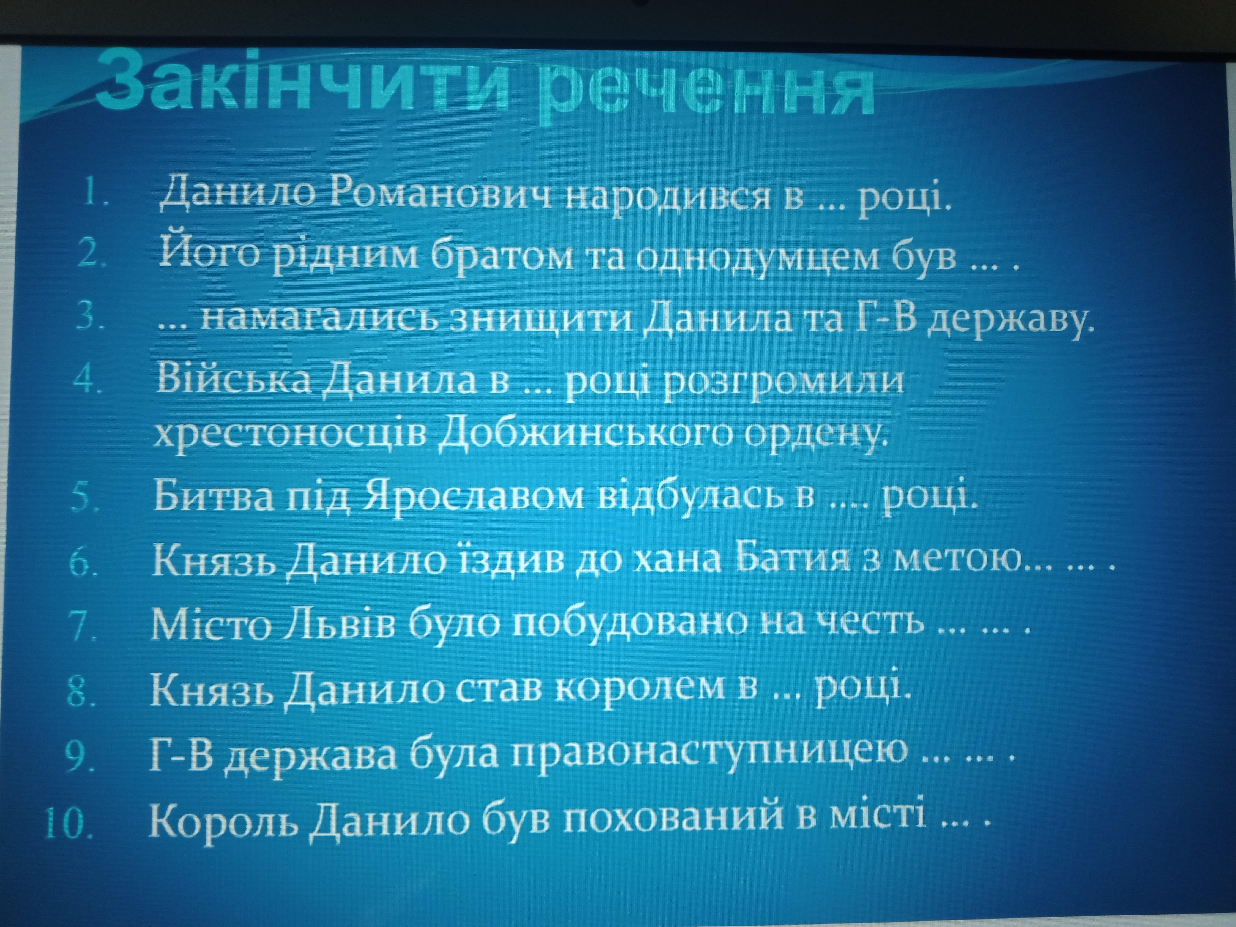 7)Львів заснований у часи правління Данила Романовича, а перша згадка про місто датується 1256 р. Назване воно на честь його сина – князя Лева.