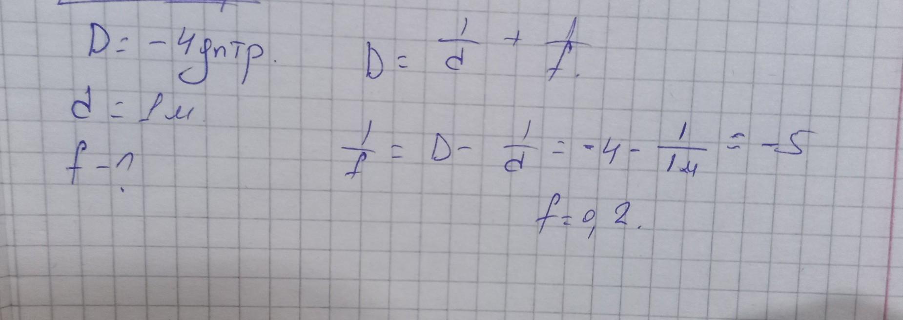 оптична сила розсіювальної лінзи -4дптр. предмет розташований на відстані 1 м лінзи. визначте відстань від лінзи до уявного зображення предмета