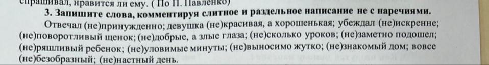 Отвечал не принуждённо;девушка некрасивая ,а хорошенькая;убеждал не искрение ; не поворотный щенок ;недобрые, а злые глаза;несколько уроков ; не заметно подошёл; неряшливый ребёнок; неуловимые минуты; не выносимо жутко; незнакомый дом ; вовсе безобразный ; ненастный день.
