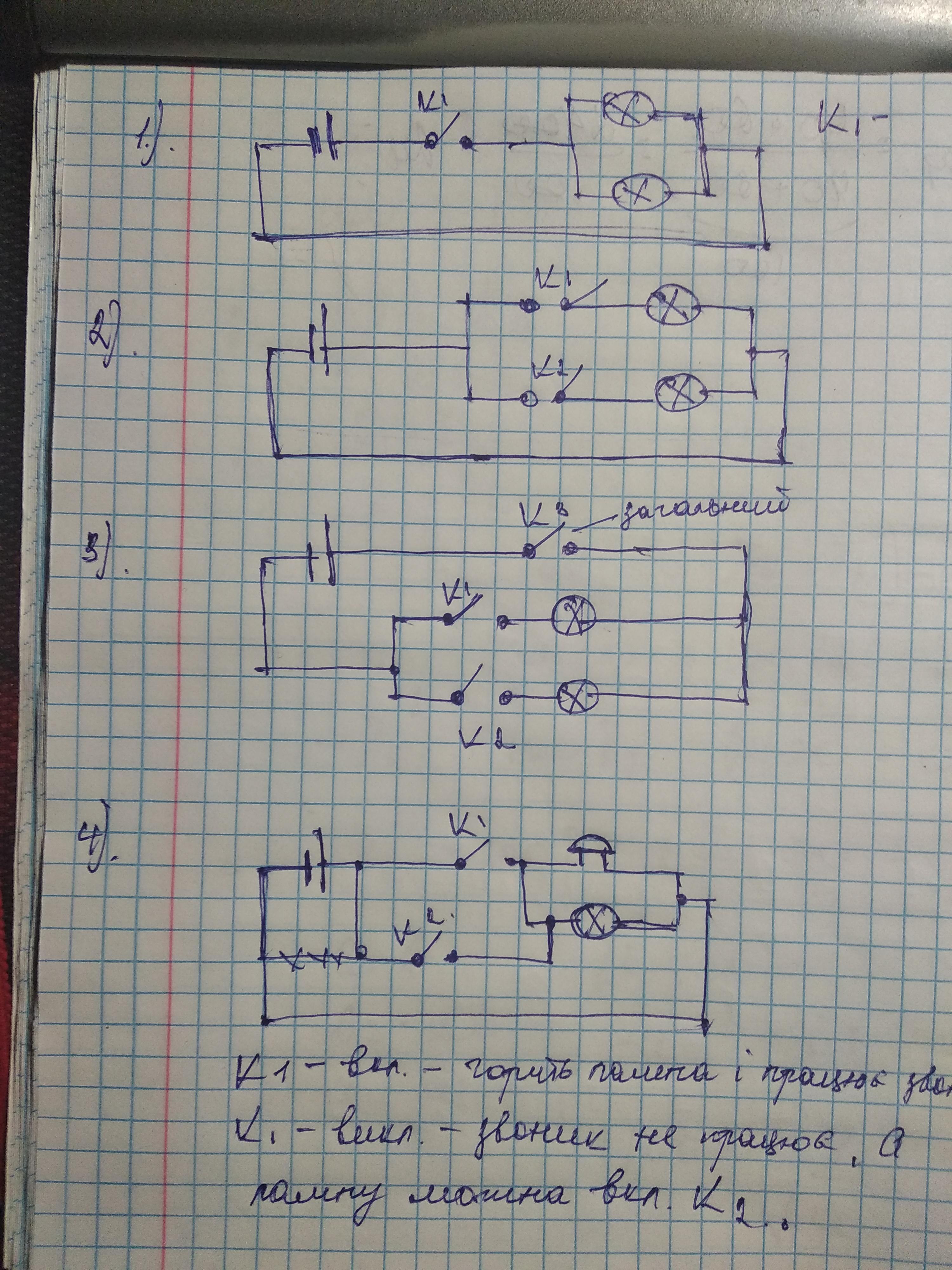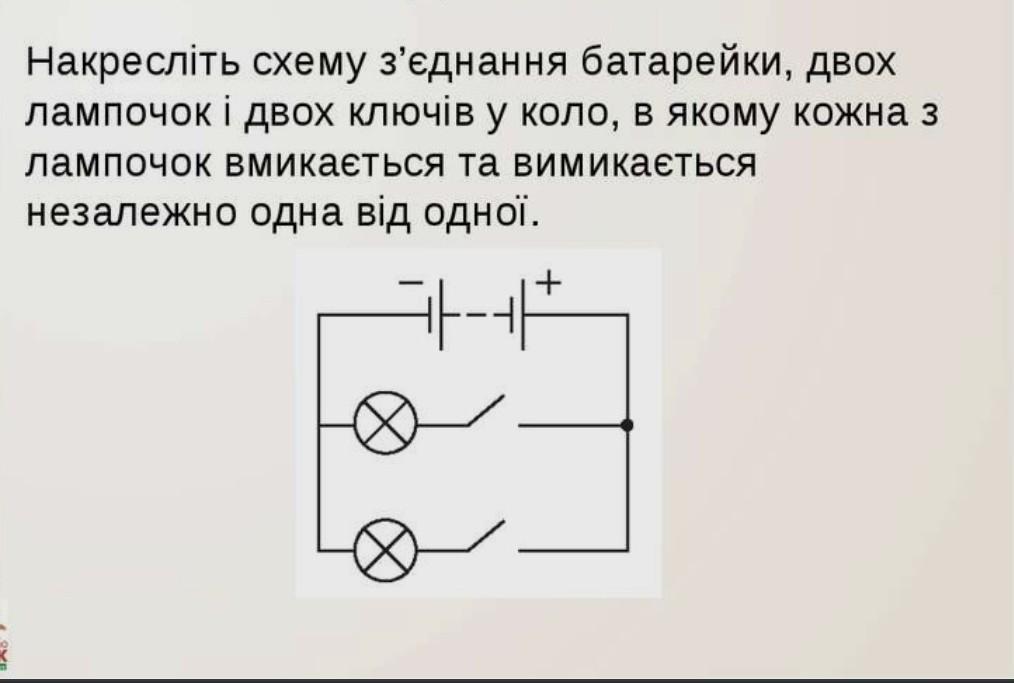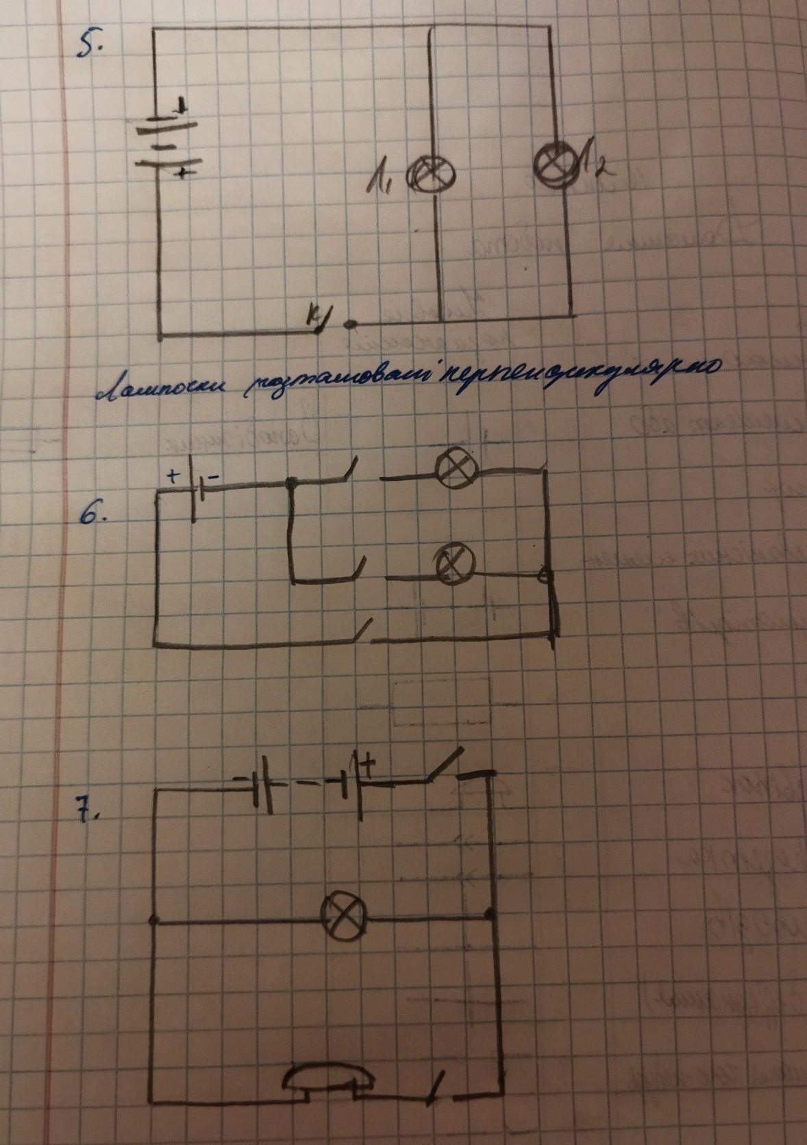 1. Накресліть схему з’єднання батарейки, двох лампочок і ключа в коло, в якому вмикання та вимикання лампочок здійснюється одним ключем. 2. Накресліть схему з’єднання батарейки, двох лампочок і двох ключів у коло, в якому кожна з лампочок вмикається та вимикається незалежно одна від одної. 3. Накресліть схему з’єднання батарейки, двох лампочок і трьох ключів у коло, в якому кожною з лампочок керує свій ключ, а розмикання третього ключа приводить до вимикання обох лампочок. 4. Накресліть схему з’єднання батарейки, лампочки, дзвінка й двох ключів. Лампочка вмикається щоразу, коли дзвонить дзвінок, але може працювати й у випадку, коли дзвінок вимкнений.