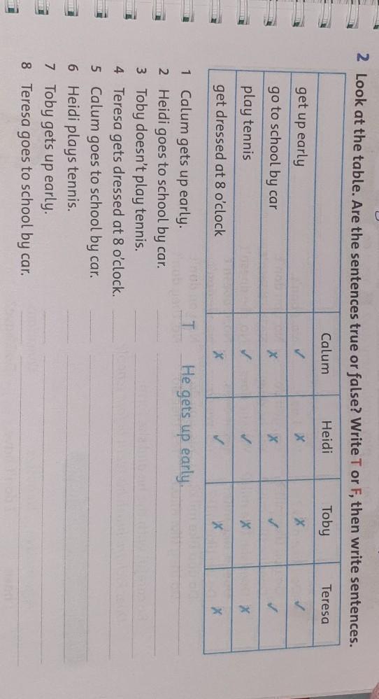 2 Look at the table. Are the sentences true or false? Write T or F, then write sentences. Calum Heidi Toby Teresa : get up early X go to school by car play tennis x get dressed at 8 o'clock X T He gets up early 1 Calum gets up early. 2 Heidi goes to school by car. 3 Toby doesn't play tennis. 4 Teresa gets dressed at 8 o'clock. 5 Calum goes to school by car. 6 Heidi plays tennis. 7 Toby gets up early. 8 Teresa goes to school by car.