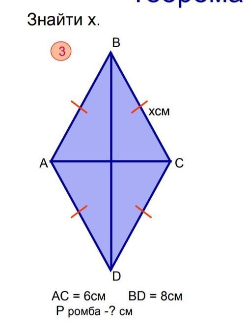 По условия нам дан ромб, а значит 2 диагонали пересекаются между собой в центре, по условию задачи. Что бы найти x, нам нужно сначала найти 2 катета. Делим AC и BD на 2 -