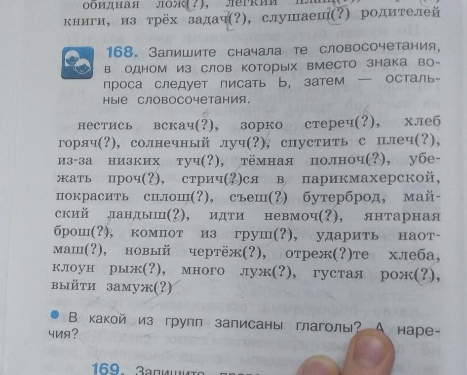 Запишите сначала те словосочетания, одном из слов которых вместо знака во- B проса следует писать ь, затем ные словосочетания. вcкач(?), нестись зорко стереч(?), горяч(?), солнечный луч(?), спустить с плеч?), низких туч(?), тёмная полноч(?), убе- проч(?), стрич(?)ся парикмахерской, покрасить сплош(?), съеш(?) бутерброд, май- ский ландыш(?), идти невмоч(?), брош(?), компот груш(?), ударить маш(?), новый чертёж(?), отреж(?)те хлеба, клоун рыж(?), много луж(?), густая густая рож(?), выйти замуж(?) жать В янтарная наот- ИЗ
