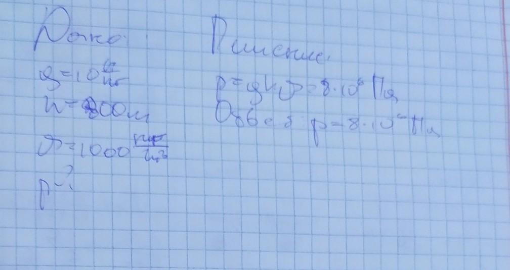 На какое минимальное давление должна быть рассчитана подводная лодка, максимальная глубина погружения которой H = 800 м? Примите равными значение g – 10 Н/кг и плотность воды ρ = 1000 кг/м3. Атмосферное давление считать малым и не учитывать.