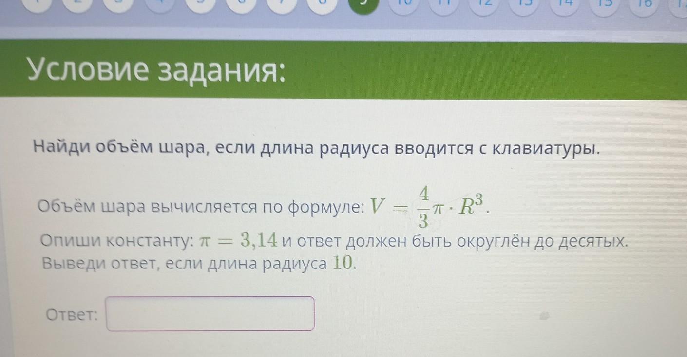 Найди объём шара, если длина радиуса вводится с клавиатуры. п: R3 4 Объём шара вычисляется по формуле: V - 3 Опиши Константу: п— 3,14 и ответ должен быть округлён до десятых. Выведи ответ, если длина радиуса 10. Ответ: E ni 1 LE игт - пір 1.1 аш али і