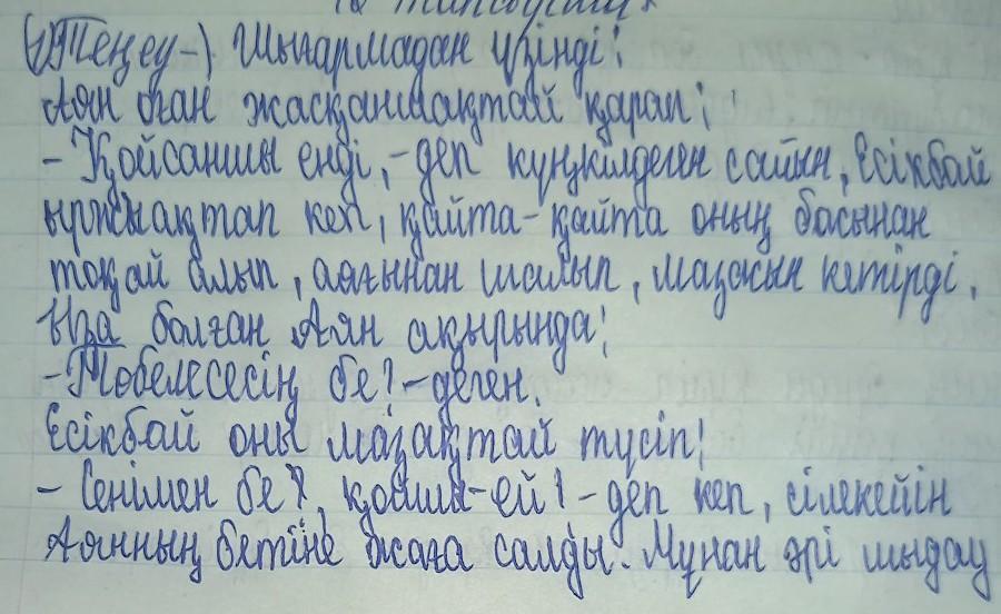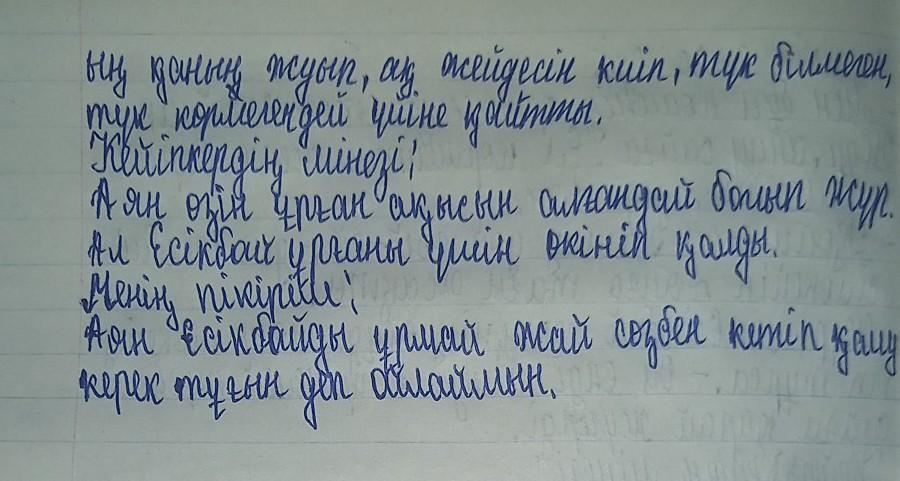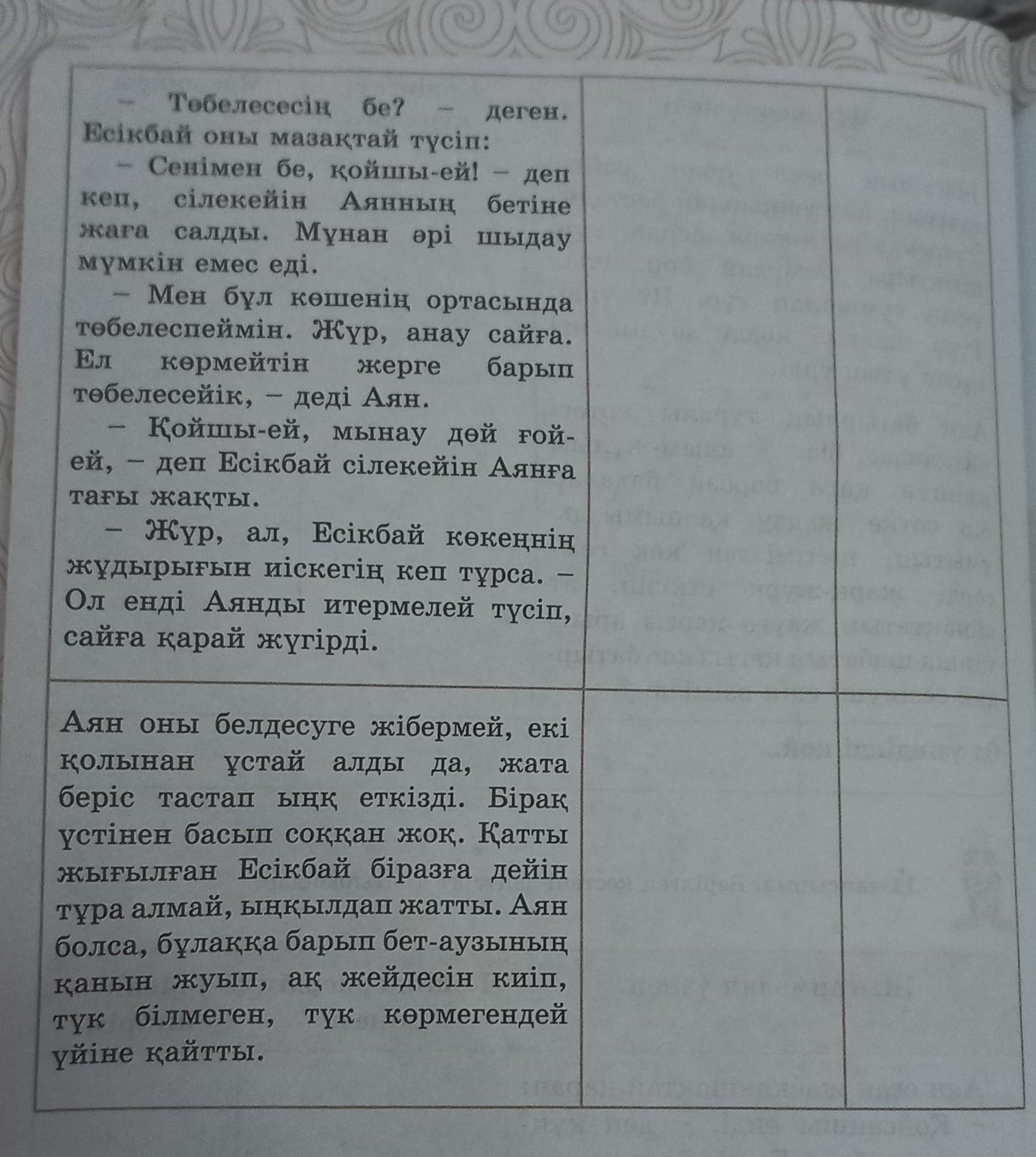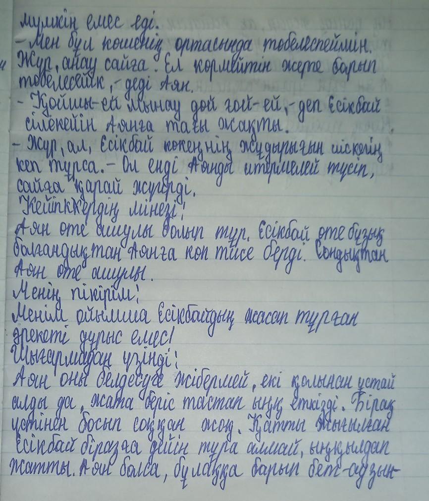 11-тапсырма. Берілген кестені дәптерге толтырыңдар. Шығармадан үзінді Кейіпкерлердің мінезі Менің пікірім Аян оған жасқаншақтай қарап: Қойсаңшы енді, деп күң- кілдеген сайын, Есікбай ыржақтап кеп, қайта-қайта оның басынан тоқай алып, аяғынан шалып, мазасын кетірді. Ыза болған Аян ақырында: