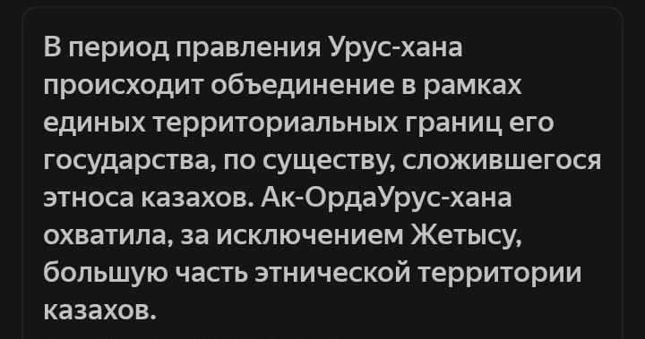 В период правления Урус-хана происходит объединение в рамках единых территориальных границ его государства, по существу, сложившегося этноса казахов. Ак-ОрдаУрус-хана охватила, за исключением Жетысу, большую часть этнической территории казахов.