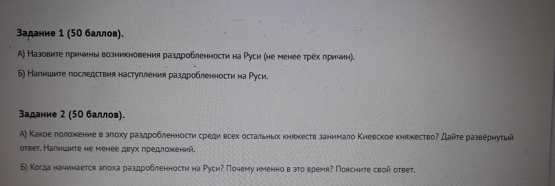 Задание 1 (50 баллов). A) Назовите причины возникновения раздробленности на Руси (не менее трёх причин). Б) Напишите последствия наступления раздробленности на Руси. Задание 2 (50 баллов). А) Какое положение в эпоху раздробленности среди всех остальных княжеств занимало Киевское княжество? Дайте развёрнутый ответ. Напишите не менее двух предложений. Б) Когда начинается эпоха раздробленности на Руси? Почему именно в это время? Поясните свой ответ.